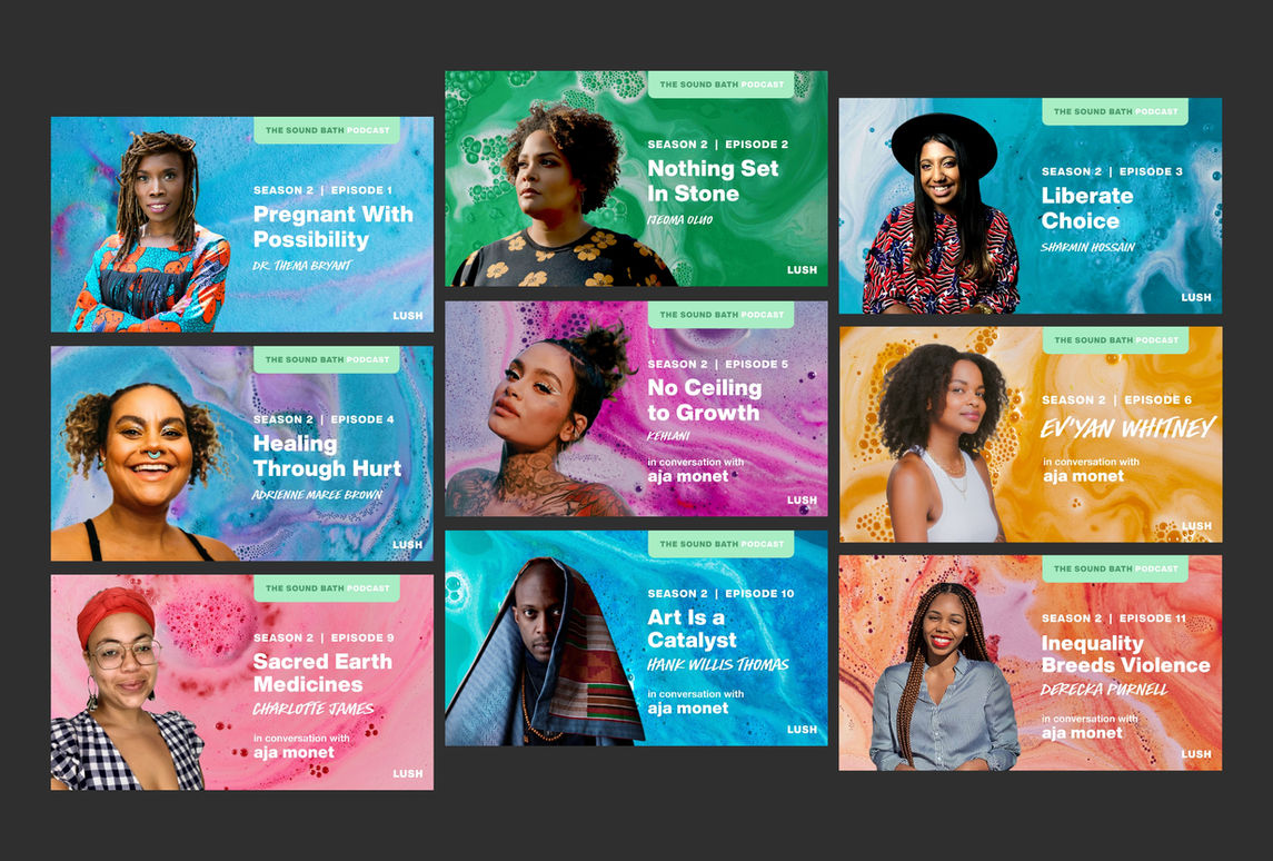 The Sound Bath Podcast was created by Lush Cosmetics and is an immersive podcast hosted by Aja Monet with interviews from activists, creators, authors, chefs, and artists. I was the graphic designer on this project and worked with the Lush creative team to design this project.